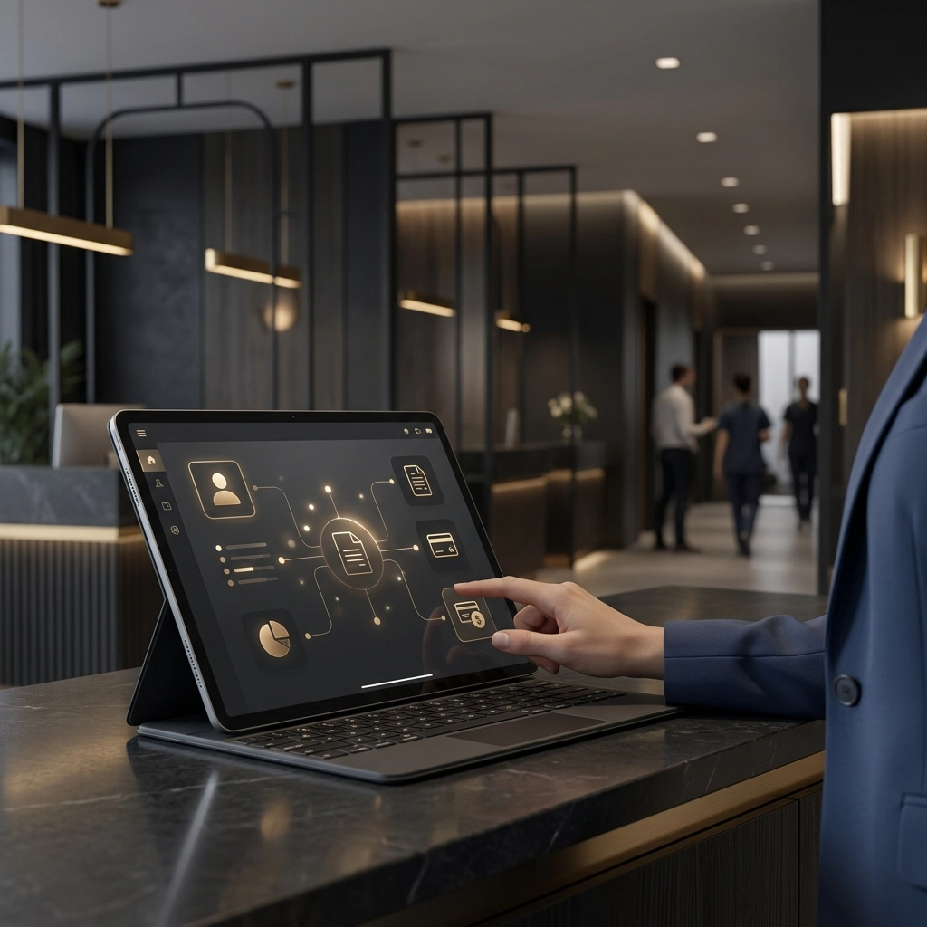 A modern clinic setting where staff use sleek, integrated tablets to manage patient workflows, emphasizing the reduction of manual paperwork.